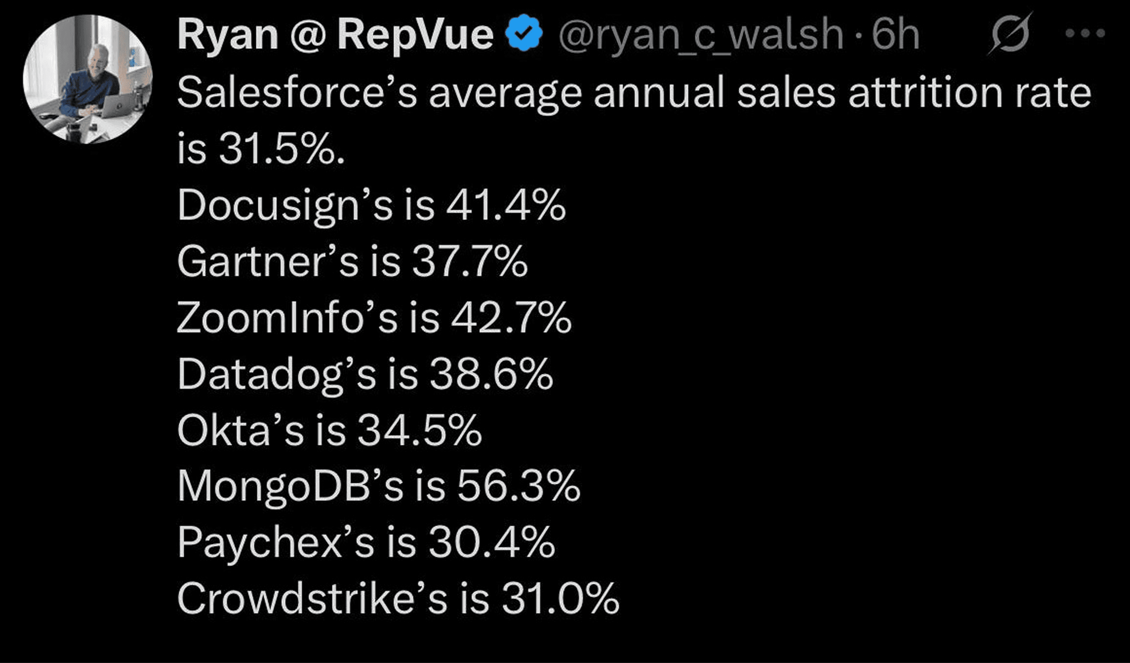Public benchmarks show an even starker reality. Leading SaaS companies frequently operate with annual sales attrition above 30 percent, with several surpassing 40 percent. These are not outliers; they reflect the volatility of modern sales teams.