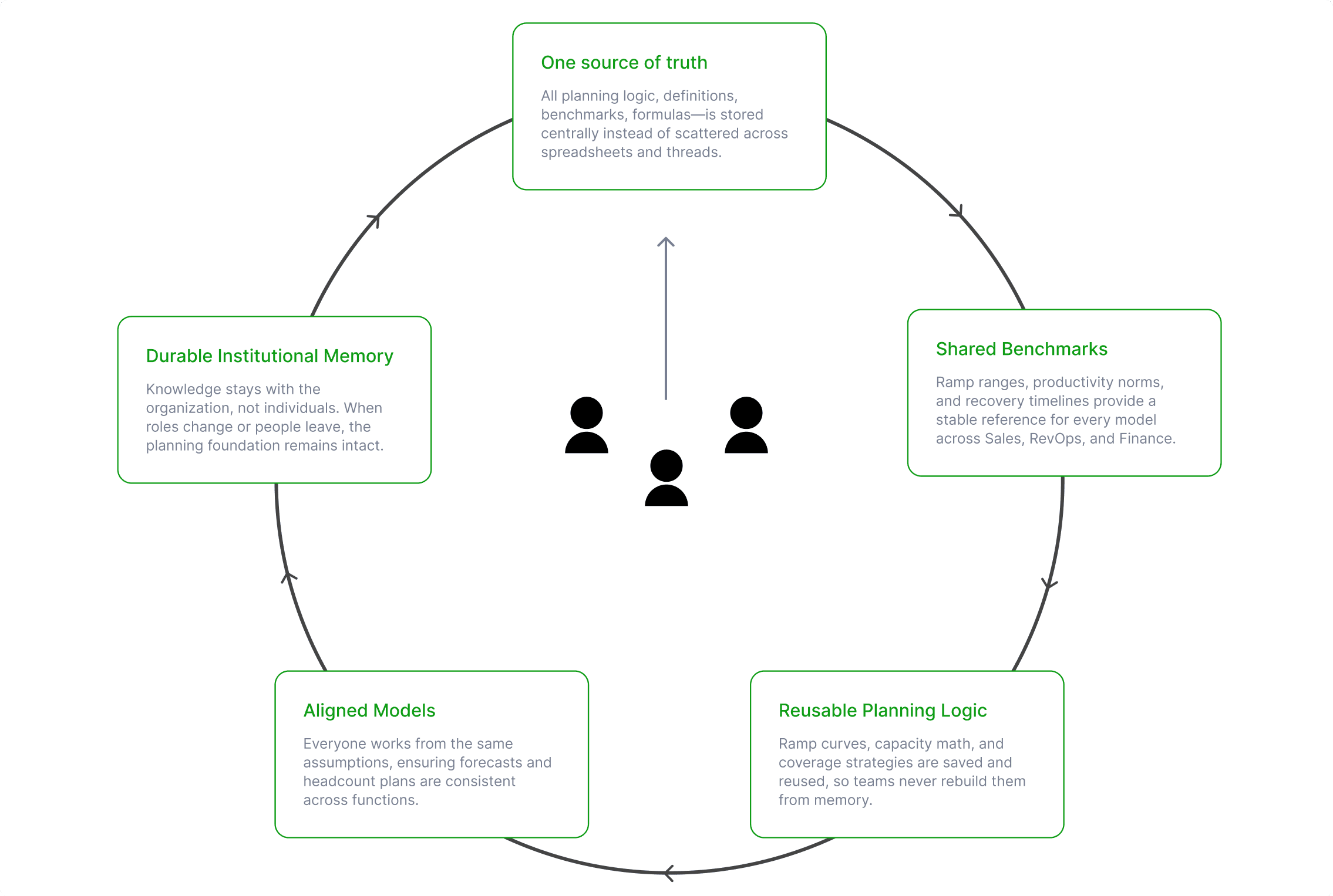 A Sales Wiki gives professionals a place to build this shared foundation. It captures what teams learn about ramp time, coverage ratios, headcount modeling, and capacity behavior. Others can update and improve that knowledge as markets shift and new patterns emerge. The result is a living reference that reflects real operational experience, not assumptions recreated each quarter.