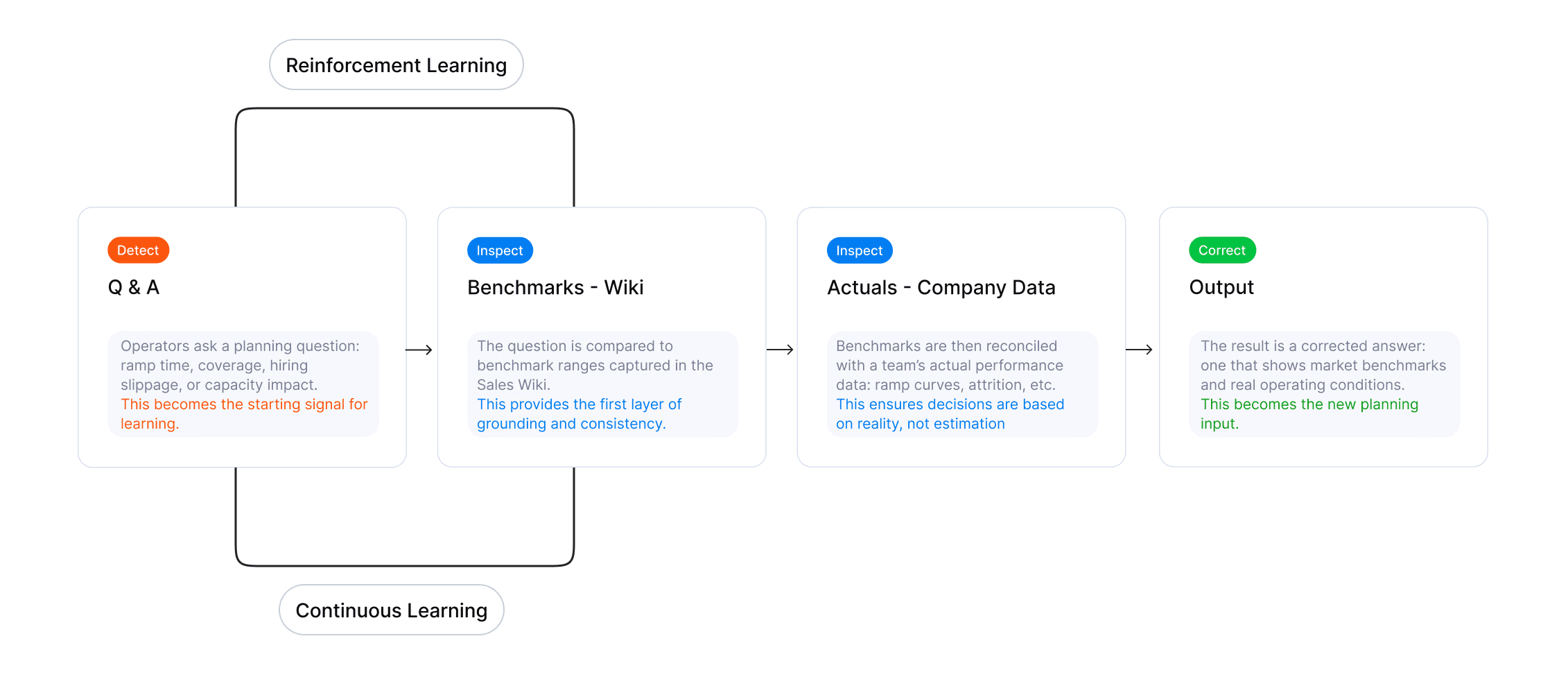 When someone learns how to better model hiring slippage, understand attrition recovery, or improve SDR allocation, that knowledge becomes part of the system. Over time, the Wiki becomes a collective memory that tools, spreadsheets, and one-off AI prompts cannot replicate.